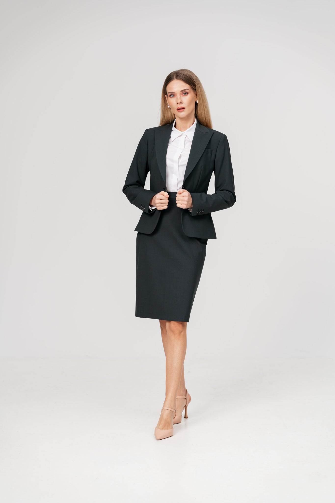 Costum office cu sacou si fusta verde