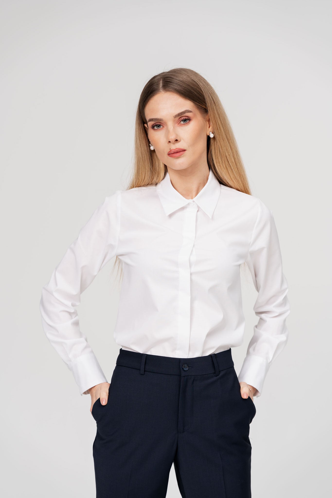 Camasa alba de dama este piesa de baza din garderoba oricarei femei, oferind un look curat si versatil. Perfecta pentru birou, intalniri formale sau tinute smart-casual, aceasta camasa se remarca prin croiala sa impecabila si materialul confortabil, asigurand un aspect elegant si rafinat.