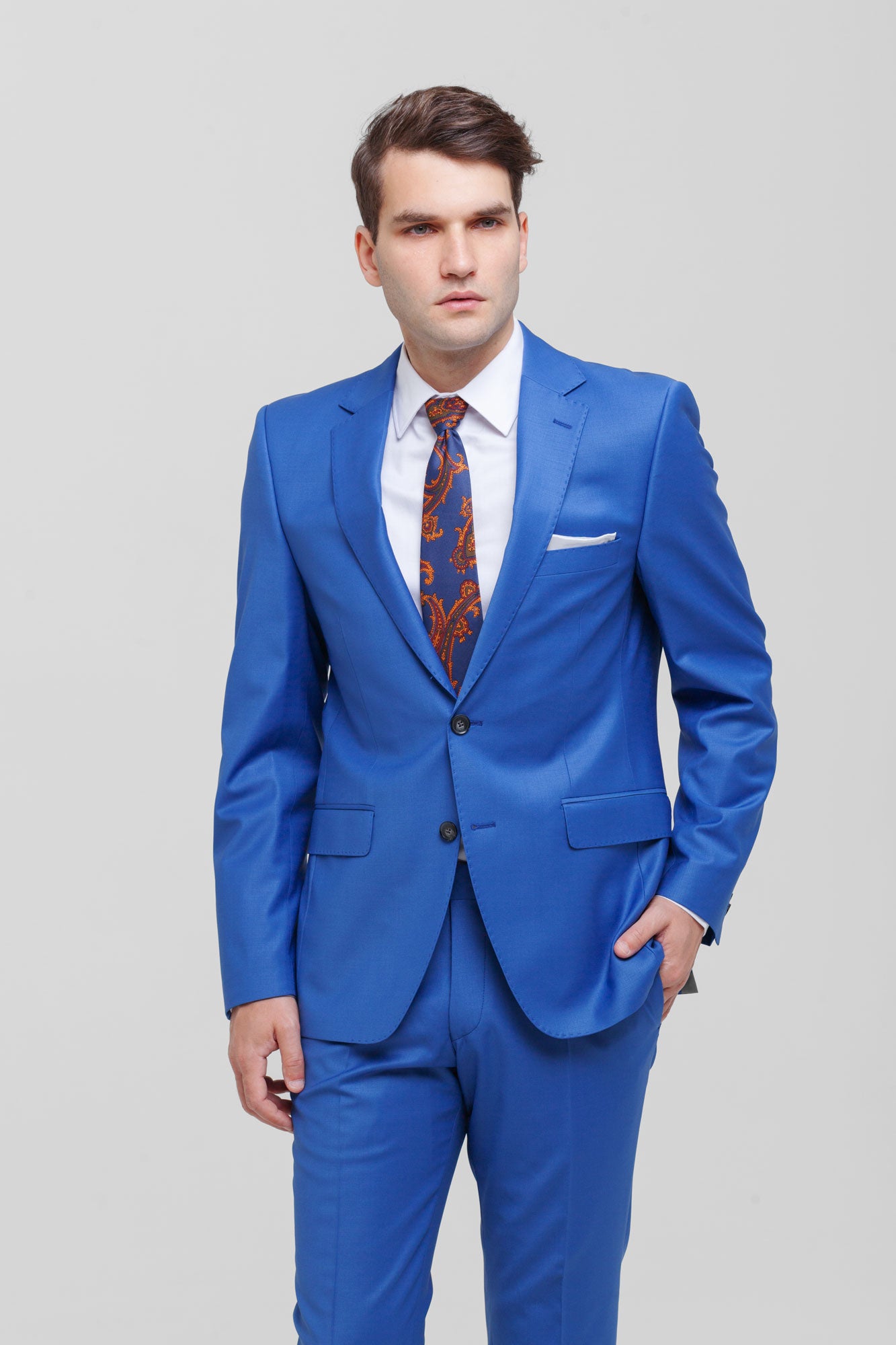 Costumul albastru este o alegere eleganta si rafinata – potrivit pentru orice ocazie. Compus din doua piese – sacou si pantaloni – acest costum este definit de o croiala moderna oferind un aspect curat si profesionist. Potrivit atat pentru evenimente formale, cat si pentru întalniri de afaceri sau ocazii speciale acesta este usor de asortat si il poti purta cu incredere in orice context.